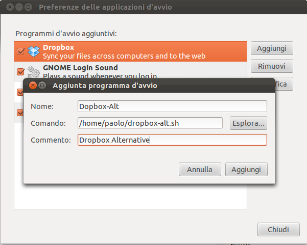 Terminata l'installazione bisogna fare in modo che venga avviata la nuova istanza di Dropbox all'avvio del PC. Per farlo creare lo script dropbox-alt.sh contenente le seguenti istruzioni:
